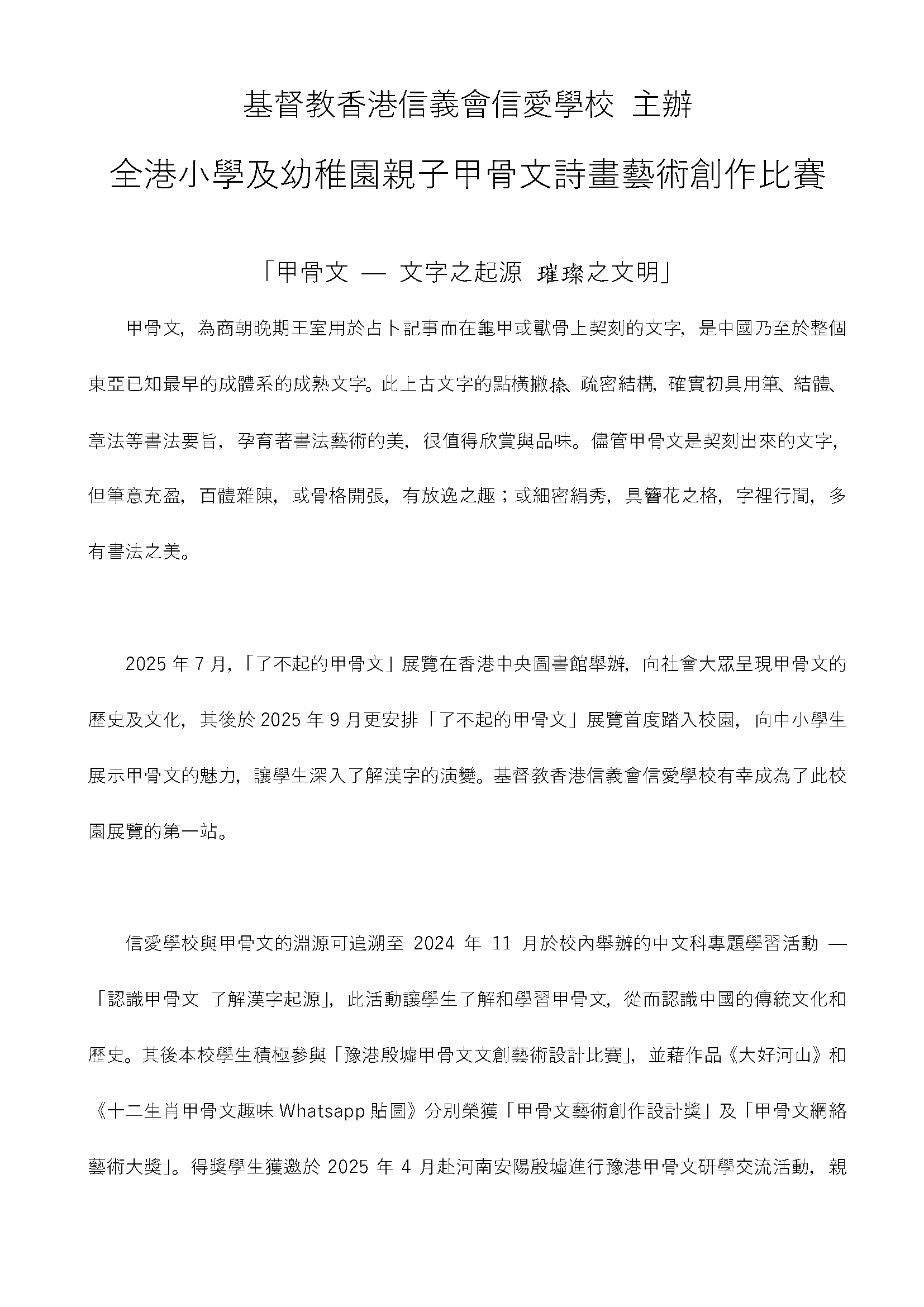 全港小學及幼稚園 親子甲骨文詩畫藝術創作比賽